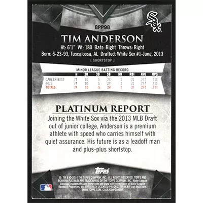 This is a 2014 Bowman Platinum Prospects Tim Anderson baseball card. The card is #BPP98 and pictures show condition.
