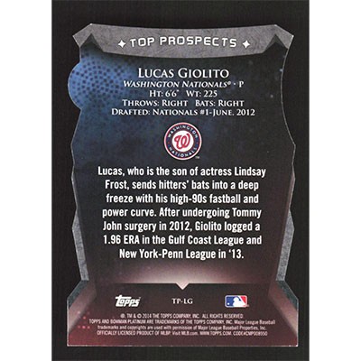 This is a 2014 Bowman Platinum Top Prospects Die Cuts Lucas Giolito baseball card. The card is #TP-LG and pictures show condition. Team(s): Hagerstown Suns