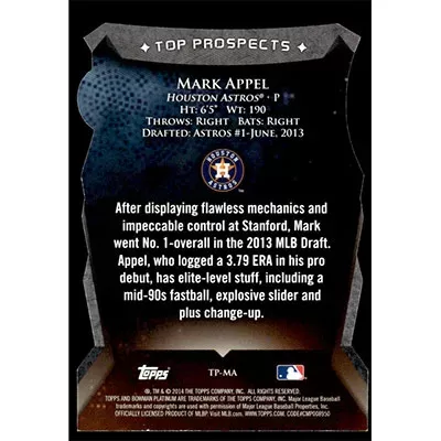 This is a 2014 Bowman Platinum Top Prospects Die Cuts Mark Appel baseball card. The card is #TP-MA and pictures show condition.