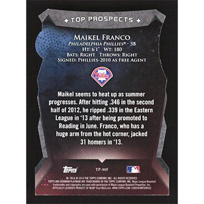 This is a 2014 Bowman Platinum Top Prospects Die Cuts Maikel Franco baseball card. The card is #TP-MF and pictures show condition. Team(s): Philadelphia Phillies