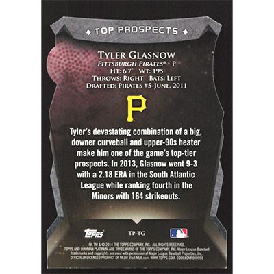 This is a 2014 Bowman Platinum Top Prospects Die Cuts Tyler Glasnow baseball card. The card is #TP-TG and pictures show condition. Team(s): Pittsburgh Pirates