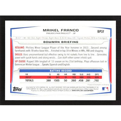 This is a 2014 Bowman Prospects Maikel Franco baseball card. The card is #BP37 and pictures show condition.