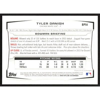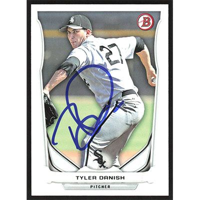 This is a 2014 Bowman Prospects Tyler Danish autographed baseball card. This card has been signed, in blue, by Tyler Danish, and is guaranteed authentic by Ballcardz.com. The card is #BP54 and pictures show condition.