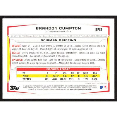 This is a 2014 Bowman Prospects Brandon Cumpton baseball card. The card is #BP81 and pictures show condition.