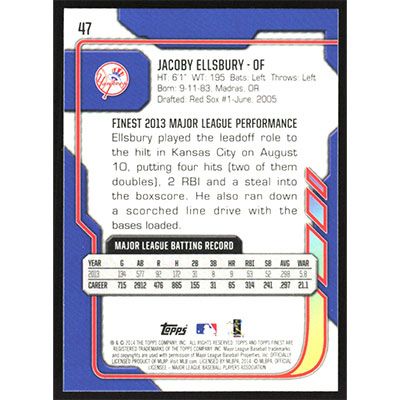 This is a 2014 Finest Jacoby Ellsbury baseball card. The card is #47 and pictures show condition.