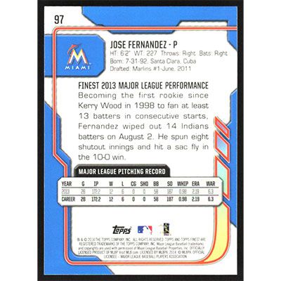 This is a 2014 Finest Jose Fernandez baseball card. The card is #97 and pictures show condition.
