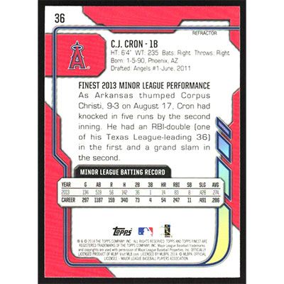 This is a 2014 Finest Refractors C.J. Cron baseball card. The card is #36 and pictures show condition.
