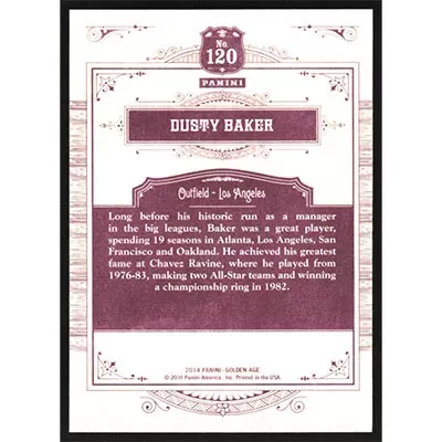 This is a 2014 Panini Golden Age Dusty Baker baseball card. The card is #120 and pictures show condition.