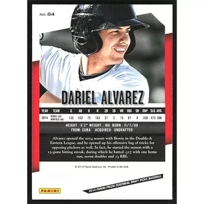 This is a 2014 Panini Prizm Perennial Draft Picks Dariel Alvarez baseball card. The card is #84 and pictures show condition.