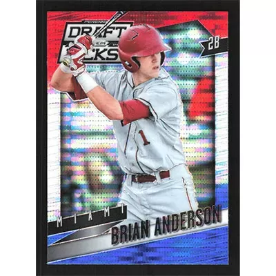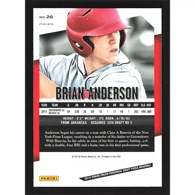 This is a 2014 Panini Prizm Perennial Draft Picks Prizms Red White and Blue Pulsar Brian Anderson baseball card. The card is #26 and pictures show condition.