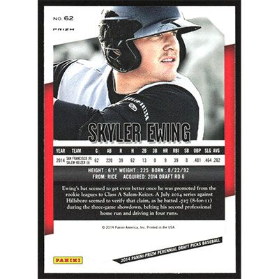 This is a 2014 Panini Prizm Perennial Draft Picks Red White and Blue Pulsar Skyler Ewing baseball card. The card is #62 and pictures show condition. Team(s): San Francisco Giants