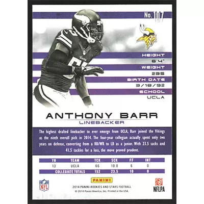 This is a 2014 Rookies & Stars Anthony Barr football card. The card is #107 and pictures show condition.
