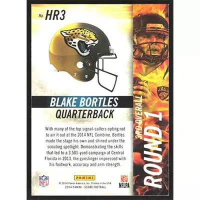 This is a 2014 Score Hot Rookies Blake Bortles football card. The card is #HR3 and pictures show condition.