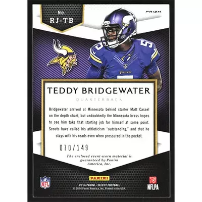 This is a 2014 Select Rookie Jerseys Prizm Red Teddy Bridgewater Jersey football card. The card is #RJ-TB and pictures show condition. This card is limited; #'d 070/149.