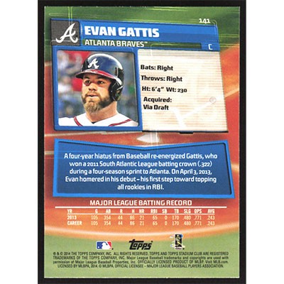 This is a 2014 Stadium Club Evan Gattis baseball card. The card is #141 and pictures show condition.