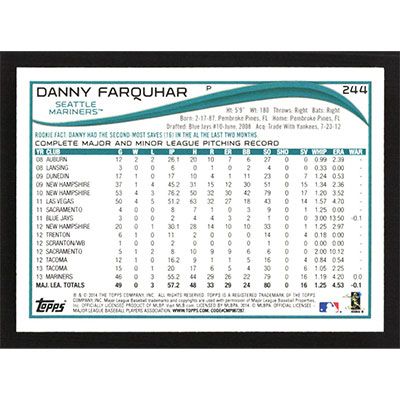 This is a 2014 Topps Danny Farquhar baseball card. The card is #244 and pictures show condition.
