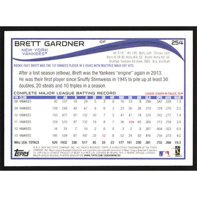 This is a 2014 Topps Brett Gardner baseball card. The card is #254 and pictures show condition.
