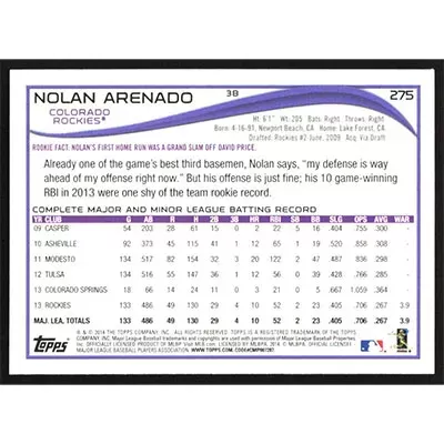 This is a 2014 Topps Nolan Arenado baseball card. The card is #275 and pictures show condition.