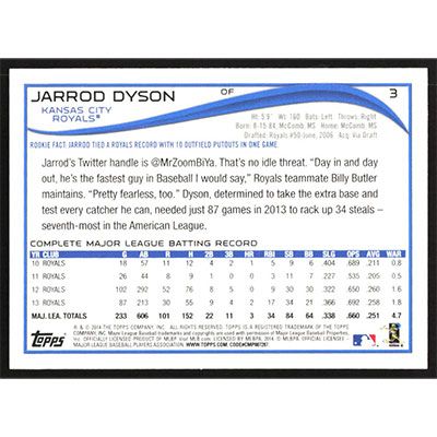 This is a 2014 Topps Jarrod Dyson baseball card. The card is #3 and pictures show condition.