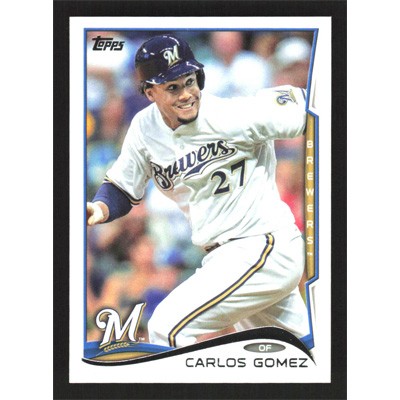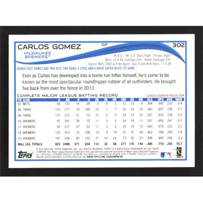 This is a 2014 Topps Carlos Gomez baseball card. The card is #302 and pictures show condition.
