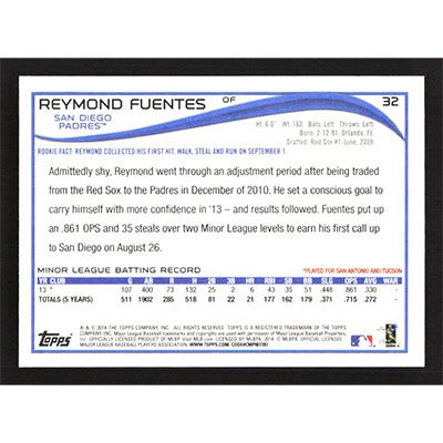 This is a 2014 Topps Reymond Fuentes baseball card. The card is #32 and pictures show condition.