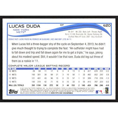 This is a 2014 Topps Lucas Duda baseball card. The card is #420 and pictures show condition.