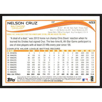 This is a 2014 Topps Nelson Cruz baseball card. The card is #453 and pictures show condition.
