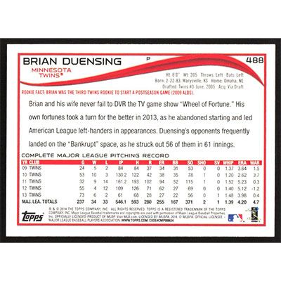 This is a 2014 Topps Brian Duensing baseball card. The card is #488 and pictures show condition.