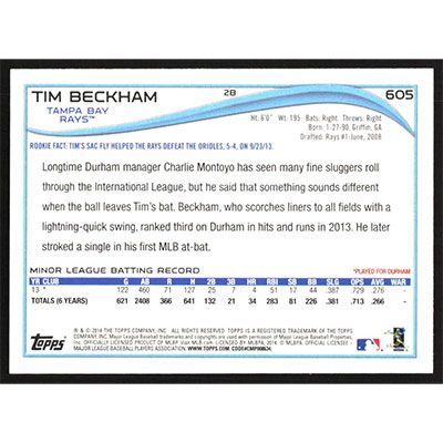 This is a 2014 Topps Tim Beckham baseball card. The card is #605 and pictures show condition.