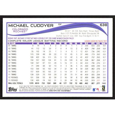 This is a 2014 Topps Michael Cuddyer baseball card. The card is #638 and pictures show condition.