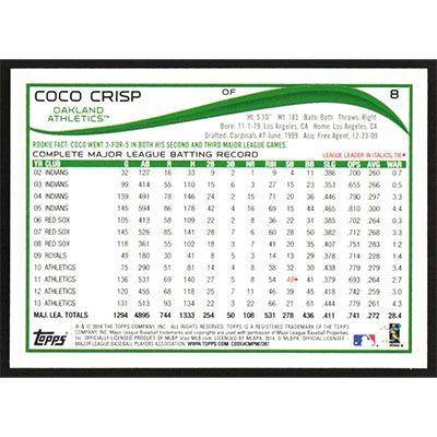 This is a 2014 Topps Coco Crisp baseball card. The card is #8 and pictures show condition.