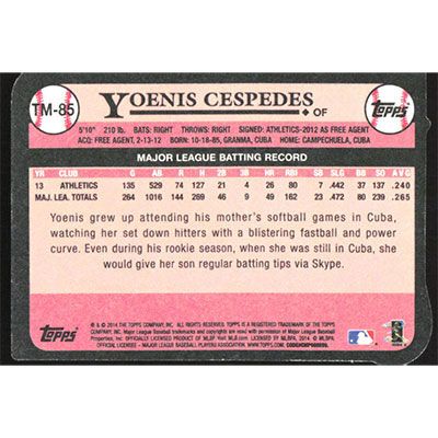 This is a 2014 Topps '89 Die Cut Minis Yoenis Cespedes baseball card. The card is #TM-85 and pictures show condition.