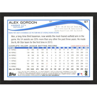 This is a 2014 Topps Alex Gordon baseball card. The card is #97 and pictures show condition.