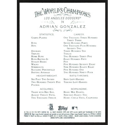 This is a 2014 Topps Allen & Ginter Adrian Gonzalez baseball card. The card is #74 and pictures show condition.