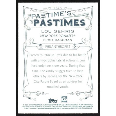 This is a 2014 Topps Allen & Ginter The Pastime's Pastime Lou Gehrig baseball card. The card is #PP-LG and pictures show condition. Team(s): New York Yankees