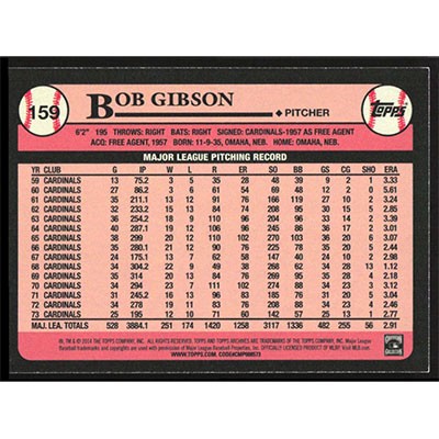This is a 2014 Topps Archives Bob Gibson baseball card. The card is #159 and pictures show condition.