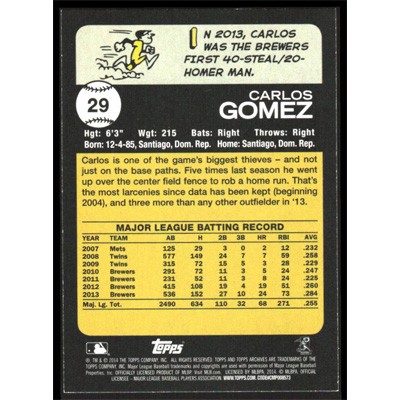 This is a 2014 Topps Archives Carlos Gomez baseball card. The card is #29 and pictures show condition.