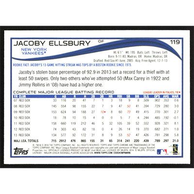 This is a 2014 Topps Chrome Jacoby Ellsbury baseball card. The card is #119 and pictures show condition.