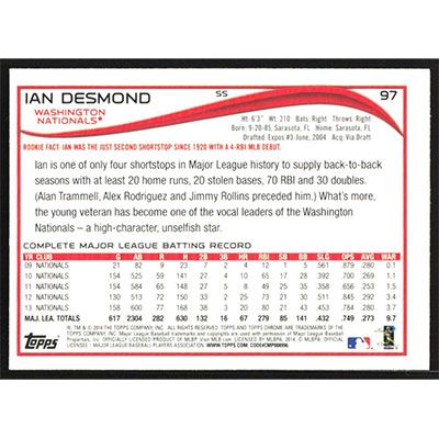 This is a 2014 Topps Chrome Ian Desmond baseball card. The card is #97 and pictures show condition.