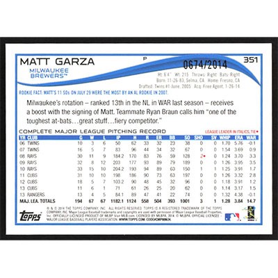 This is a 2014 Topps Gold Matt Garza baseball card. The card is #351 and pictures show condition. This card is limited; #'d 0674/2014. Team(s): Milwaukee Brewers