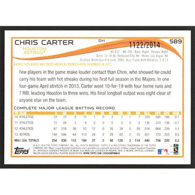 This is a 2014 Topps Gold Chris Carter baseball card. The card is #589 and pictures show condition. This card is limited; #'d 1122/2014. Team(s): Houston Astros
