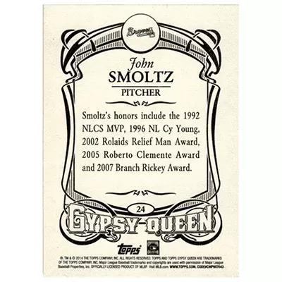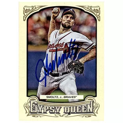 This is a 2014 Topps Gypsy Queen John Smoltz autographed baseball card.This card is signed, in blue, by John Smoltz, and is guaranteed authentic by Ballcardz.com. The card is #24 and is in NM-MT condition.