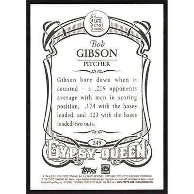 This is a 2014 Topps Gypsy Queen Bob Gibson baseball card. The card is #249 and pictures show condition.