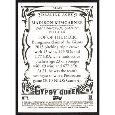 This is a 2014 Topps Gypsy Queen Dealing Aces Madison Bumgarner baseball card. The card is #DA-MB and pictures show condition. Team(s): San Francisco Giants