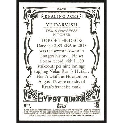 This is a 2014 Topps Gypsy Queen Dealing Aces Yu Darvish baseball card. The card is #DA-YD and pictures show condition.