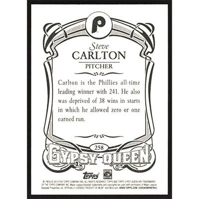 This is a 2014 Topps Gypsy Queen Framed Blue Steve Carlton baseball card. The card is #258 and pictures show condition. This card is limited; #'d 143/499.