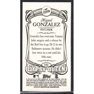 This is a 2014 Topps Gypsy Queen Mini Miguel Gonzalez baseball card. The card is #193 and pictures show condition.