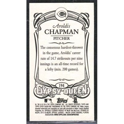 This is a 2014 Topps Gypsy Queen Mini Aroldis Chapman baseball card. The card is #194 and pictures show condition.