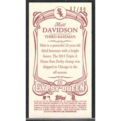 This is a 2014 Topps Gypsy Queen Mini Red Matt Davidson baseball card. The card is #221 and pictures show condition. This card is limited; #'d /99. Team(s): Chicago White Sox Rookie Card (RC)