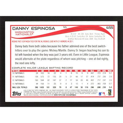 This is a 2014 Topps Orange Danny Espinosa baseball card. The card is #455 and pictures show condition.